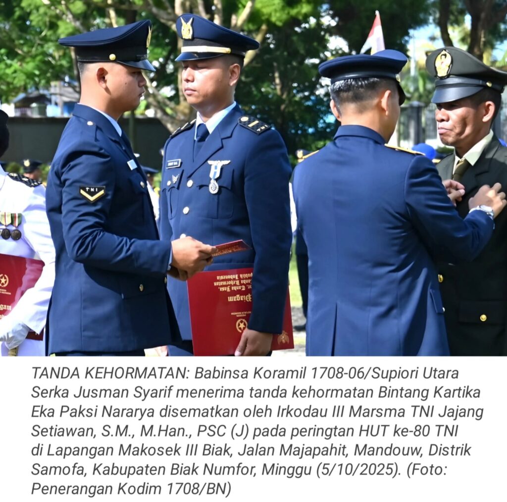 Penyerahan tanda kehormatan berlangsung dalam rangkaian Upacara Peringatan HUT ke-80 TNI yang digelar di Lapangan Makosek III Biak, Jalan Majapahit, Mandouw, Distrik Samofa, Kabupaten Biak Numfor, Papua, Minggu (5/10/2025).