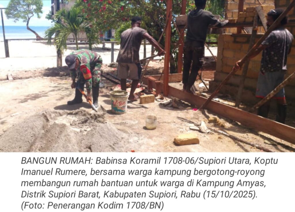 TOP-NEWS.id, SUPIORI – Babinsa Koramil 1708-06/Supiori Utara, Koptu Imanuel Rumere bersama warga Kampung bergotong- royong membangun rumah bantuan bagi warga yang belum memiliki tempat tinggal sendiri di Kampung Amyas, Distrik Supiori Barat, Kabupaten Supiori, Papua, Rabu (15/10/2025).
