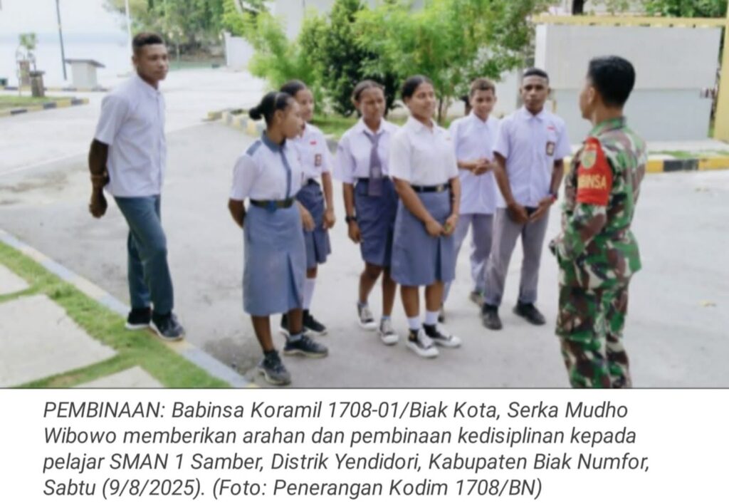 TOP-NEWS.id, BIAK – Babinsa Koramil 1708-01/Biak Kota, Serka Mudho Wibowo memberikan arahan dan pembinaan kedisiplinan kepada pelajar SMAN 1 Samber, Distrik Yendidori, Kabupaten Biak Numfor, Papua, Sabtu (9/8/2025).