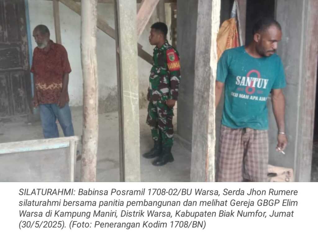 TOP-NEWS.id, WARSA – Babinsa Posramil 1708-02/BU Warsa, Serda Jhon Rumere terus menjalin komunikasi sosial (komsos) dengan warga di wilayah binaannya. Kali ini, Serda Rumere bersilaturahmi bersama panitia pembangunan gereja GBGP Elim Warsa di Kampung Maniri, Distrik Warsa, Kabupaten Biak Numfor, Papua, Jumat (30/5/2025).
