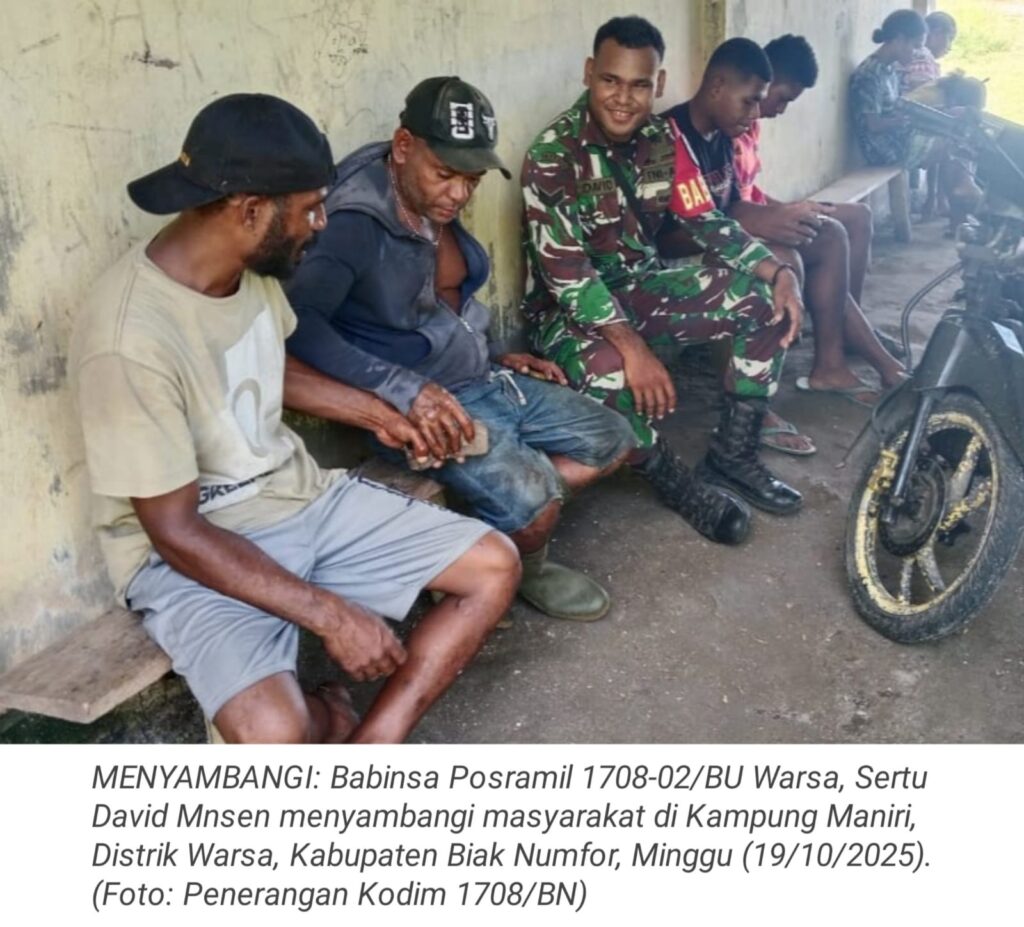 TOP-NEWS.id, WARSA – Dalam rangka mempererat hubungan silaturahmi dan menjaga komunikasi yang baik dengan warga binaan, Babinsa Posramil 1708-02/BU Warsa, Sertu David Mnsen, menyambangi masyarakat di Kampung Maniri, Distrik Warsa, Kabupaten Biak Numfor, Papua, Minggu (19/10/2025).