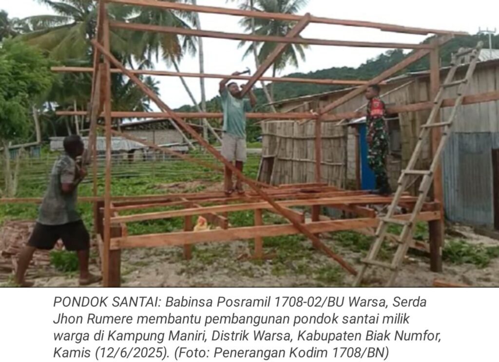 TOP-NEWS.id, WARSA – Wujud kepedulian terhadap kesulitan warga binaan, Babinsa Posramil 1708-02/BU Warsa, Serda Jhon Rumere membantu pembangunan pondok santai milik warga di Kampung Maniri, Distrik Warsa, Kabupaten Biak Numfor, Papua, Kamis (12/06/2025).