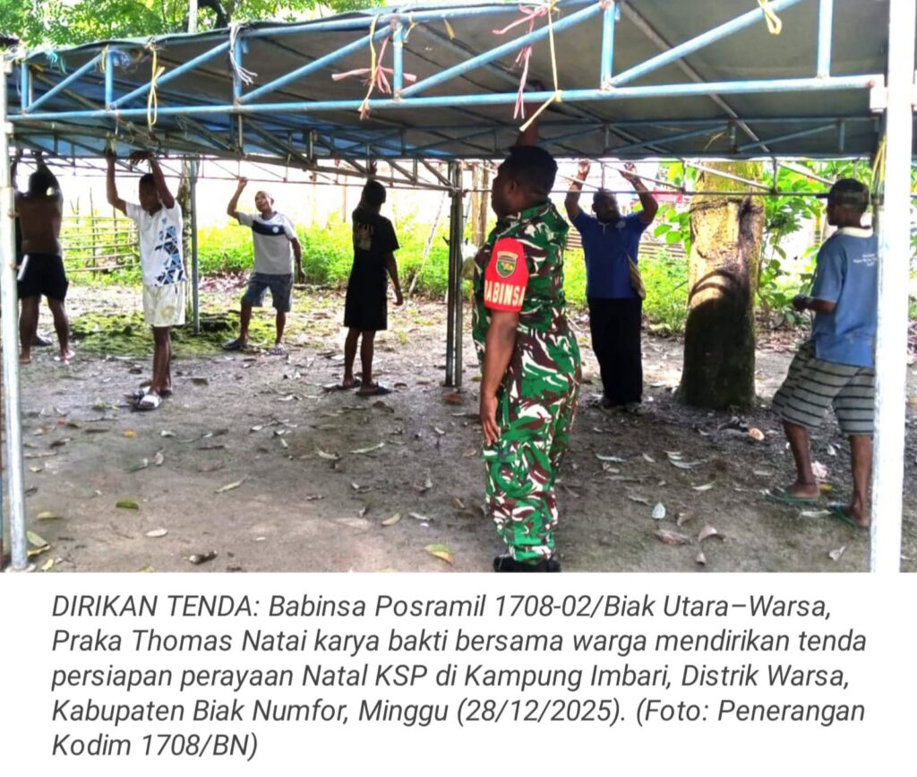 TOP-NEWS.id, WARSABabinsa Posramil 1708-02/Biak Utara–Warsa, Praka Thomas Natai melaksanakan karya bakti bersama warga mendirikan tenda persiapan perayaan Natal KSP di Kampung Imbari, Distrik Warsa, Kabupaten Biak Numfor, Papua, Minggu (28/12/2025).