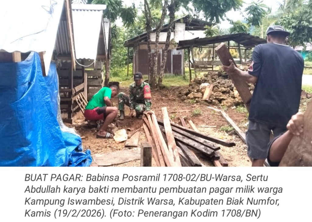 TOP-NEWS.id, WARSA – Wujud kepedulian terhadap masyarakat binaan terus ditunjukkan Babinsa Posramil 1708-02/BU-Warsa, Sertu Abdullah dengan melaksanakan karya bakti membantu pembuatan pagar milik warga Kampung Iswambesi, Distrik Warsa, Kabupaten Biak Numfor, Papua, Kamis (19/2/2026).