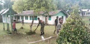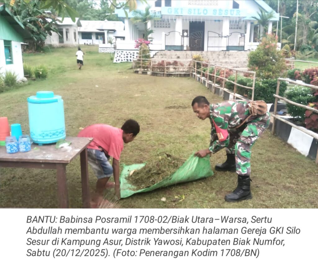 TOP-NEWS.id, WARSABabinsa Posramil 1708-02/Biak Utara–Warsa, Sertu Abdullah turut membantu warga melaksanakan kegiatan pembersihan halaman Gereja GKI Silo Sesur di Kampung Asur, Distrik Yawosi, Kabupaten Biak Numfor, Papua, Sabtu (20/12/2025).