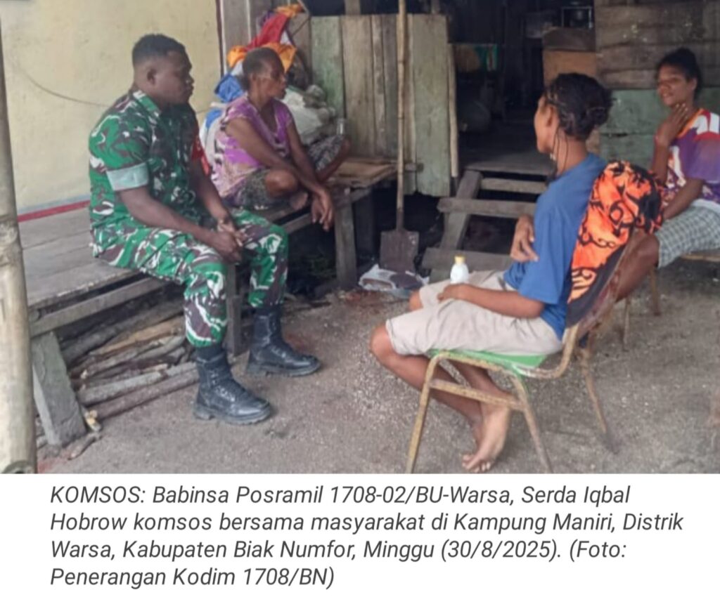 TOP-NEWS.id, WARSA – Upaya mempererat hubungan dan menciptakan suasana yang harmonis di wilayah binaan, Babinsa Posramil 1708-02/BU-Warsa, Serda Iqbal Hobrow melaksanakan kegiatan komunikasi sosial (komsos) bersama masyarakat di Kampung Maniri, Distrik Warsa, Kabupaten Biak Numfor, Papua, Minggu (31/8/2025).