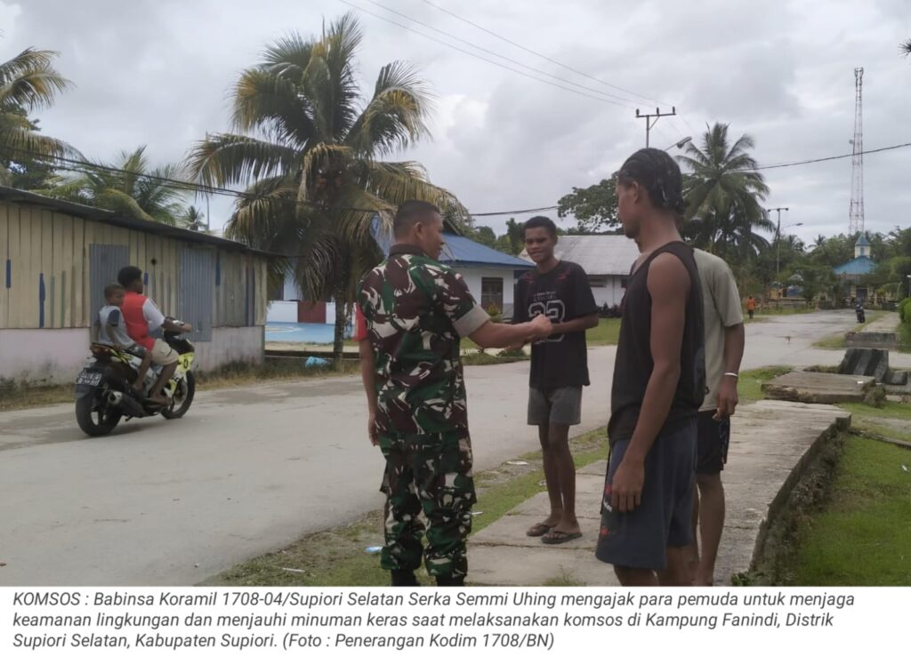 TOP-NEWS.id SUPIORI – Babinsa Koramil 1708-04/Supiori Selatan Serka Semmi Uhing melaksanakan kegiatan komunikasi sosial (Komsos) bersama para pemuda di Kampung Fanindi, Distrik Supiori Selatan, Kabupaten Supiori, Kamis (19/2/2026).