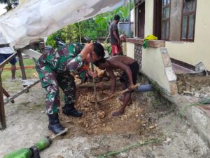 TOP-NEWS.id, Biak – Babinsa Koramil 1708-01/Biak Kota (BK) Serka Sampurno melaksanakan kegiatan karya bakti membantu bapak Kevin dan juga warga lainnya membuat pembuangan air limbah dapur di Kelurahan Sinerbo, Distrik Samofa, Kabupaten Biak Numfor, Papua, Rabu (19/6/2024).