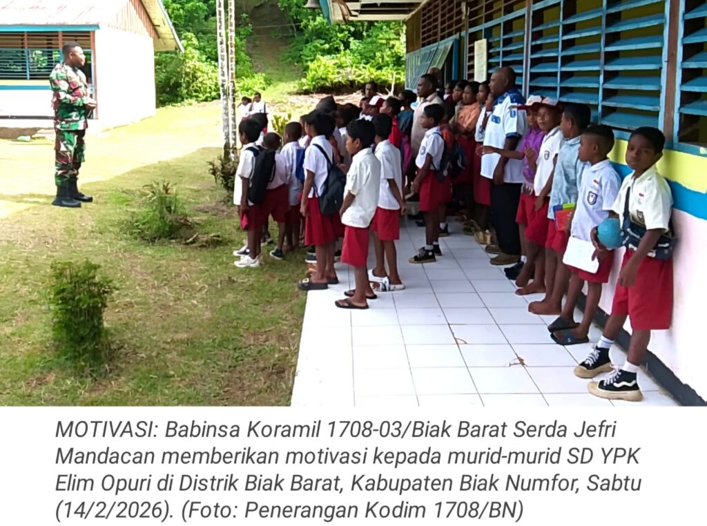 TOP-NEWS.id, BIAK BARAT – Suasana hangat dan penuh semangat terlihat saat Babinsa Koramil 1708-03/Biak Barat Serda Jefri Mandacan memberikan motivasi kepada murid-murid SD YPK Elim Opuri di Distrik Biak Barat, Kabupaten Biak Numfor, Papua, Sabtu (14/2/2026).