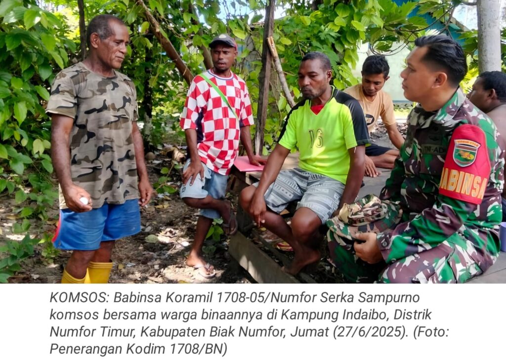TOP-NEWS.id, NUMFOR – Upaya mempererat hubungan dengan masyarakat dan menjaga kondusifitas wilayah, Babinsa Koramil 1708-05/Numfor, Serka Sampurno, melaksanakan kegiatan komunikasi sosial (komsos) bersama warga binaannya di Kampung Indaibo, Distrik Numfor Timur, Kabupaten Biak Numfor, Papua, Jumat (27/6/2025).