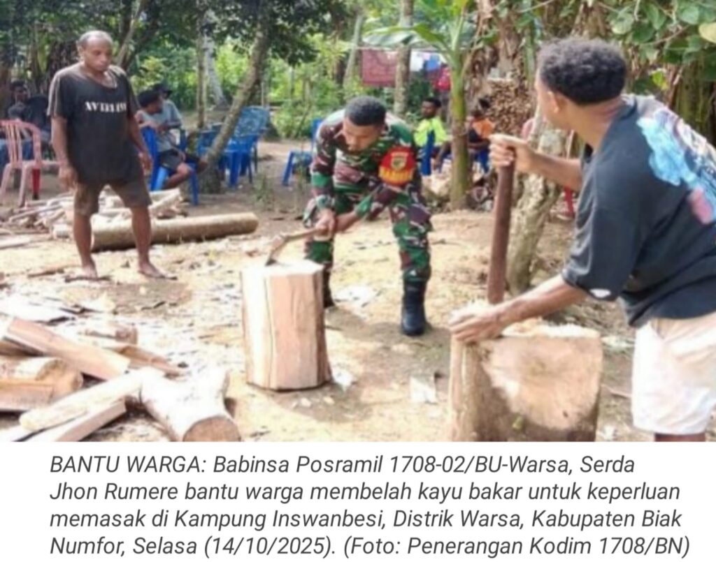 TOP-NEWS.id, WARSA – Peran Babinsa dalam kehidupan bermasyarakat sangatlah penting. Hal ini ditunjukkan Babinsa Posramil 1708-02/BU-Warsa, Serda Jhon Rumere membantu warga membelah kayu bakar untuk keperluan memasak di Kampung Inswanbesi, Distrik Warsa, Kabupaten Biak Numfor, Papua, Selasa (14/10/2025).