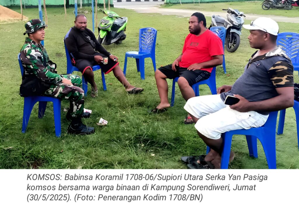 TOP-NEWS.id, SUPIORI – Upaya mempererat hubungan antara TNI dan masyarakat, Babinsa Koramil 1708-06/Supiori Utara, Serka Yan Pasiga melaksanakan kegiatan komunikasi sosial (komsos) bersama warga binaan di Kampung Sorendiweri, Distrik Supiori Timur, Kabupaten Supiori, Papua, Jumat (30/5/2025).