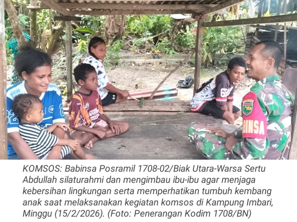 TOP-NEWS.id, WARSA – Babinsa Posramil 1708-02/Biak Utara-Warsa Sertu Abdullah terus mempererat kedekatan dengan masyarakat melalui kegiatan komunikasi sosial (komsos) di Kampung Imbari, Distrik Warsa, Kabupaten Biak Numfor, Papua, Minggu (15/2/2026).