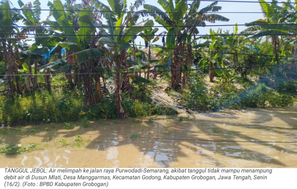 TOP-NEWS.id, JAKARTA – Banjir melanda 34 desa di sembilan kecamatan di Kabupaten Grobogan, Jawa Tengah, pada Senin (16/2) pukul 02.00 WIB. Peristiwa ini dipicu hujan dengan intensitas tinggi sejak Minggu (15/2) pukul 21.00 WIB hingga Senin (16/2) pukul 05.00 WIB, serta kiriman air dari hulu Sungai Glugu, Sungai Jajar, dan Sungai Tuntang yang menyebabkan sungai meluap. Total sebanyak 5.214 kepala keluarga (KK) terdampak dan satu unit rumah dilaporkan rusak berat.