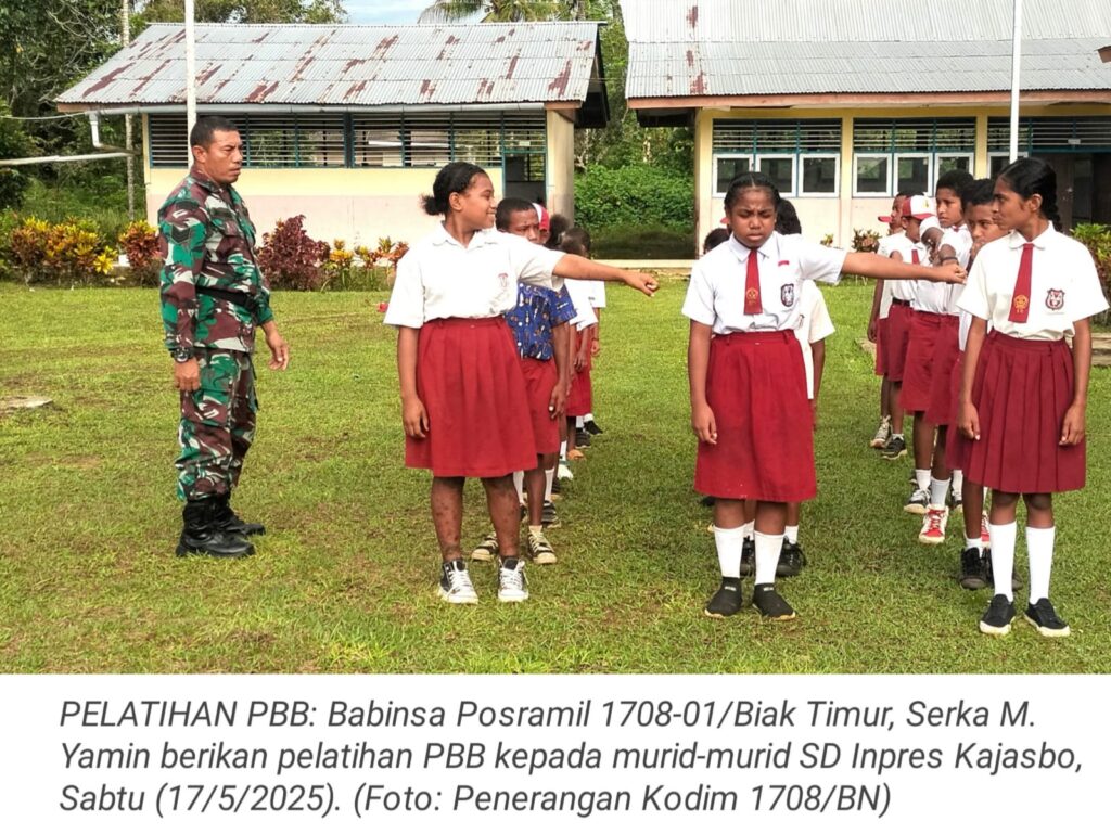 TOP-NEWS.id, BIAK TIMUR – Guna menanamkan kedisiplinan sejak dini, Babinsa Posramil 1708-01/Biak Timur, Serka M. Yamin memberikan pelatihan Peraturan Baris Berbaris (PBB) kepada murid-murid Sekolah Dasar (SD) Inpres Kajasbo, Distrik Biak Timur, Kabupaten Biak Numfor, Papua, Sabtu (17/5/2025).