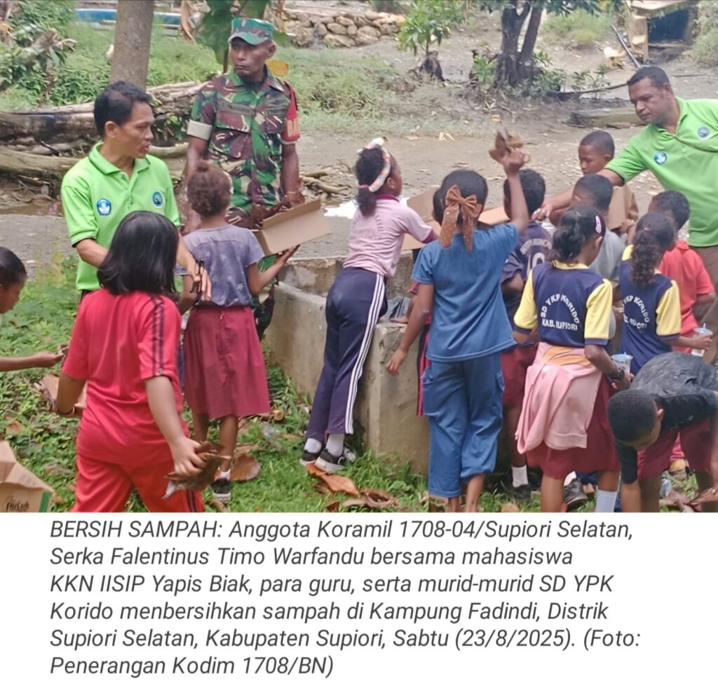 TOP-NEWS.id, SUPIORI – Dalam rangka menciptakan lingkungan yang bersih, sehat, dan nyaman, Koramil 1708-04/Supiori Selatan bersama mahasiswa Kuliah Kerja Nyata (KKN) IISIP Yapis Biak, para guru, serta murid-murid SD YPK Korido menggelar kegiatan kerja bakti di Kampung Fadindi, Distrik Supiori Selatan, Kabupaten Supiori, Papua, Sabtu (23/8/2025).