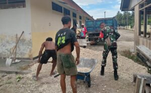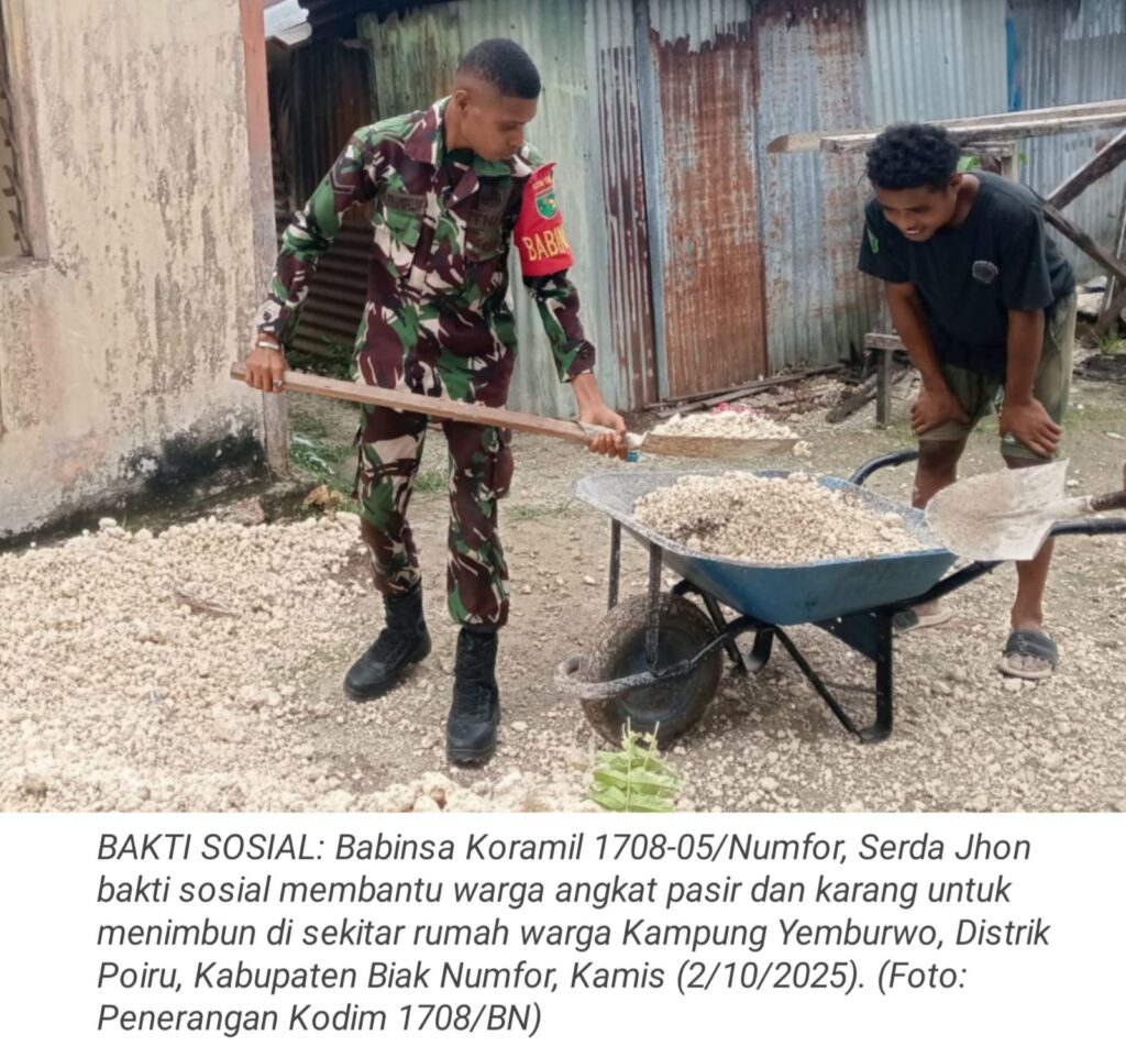 TOP-NEWS.id, NUMFOR – Dalam rangka mempererat sinergi antara TNI dan masyarakat, Babinsa Koramil 1708-05/Numfor, Serda Jhon Frangklin melaksanakan kegiatan bakti sosial membantu warga menimbun pasir dan karang di sekitar rumah warga Kampung Yemburwo, Distrik Poiru, Kabupaten Biak Numfor, Papua, Kamis (2/10/2025).