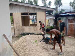 Dalam aksi sosial tersebut, Serda Jhon turut bekerja bersama dengan warga mengangkat dan meratakan timbunan pasir dan karang yang akan digunakan sebagai dasar pembangunan rumah warga.