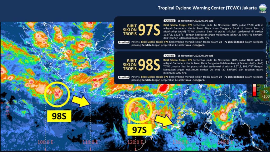 TOP-NEWS.id, JAKARTA – Badan Meteorologi, Klimatologi, dan Geofisika (BMKG) mendeteksi adanya dua Bibit Siklon Tropis, yakni 97S dan 98S, yang saat ini aktif di dekat wilayah Indonesia. Meskipun kedua bibit siklon ini memiliki potensi rendah untuk berkembang menjadi siklon tropis dalam 72 jam ke depan, dampaknya (baik langsung maupun tidak langsung) tetap signifikan memicu cuaca ekstrem di sejumlah wilayah Indonesia.