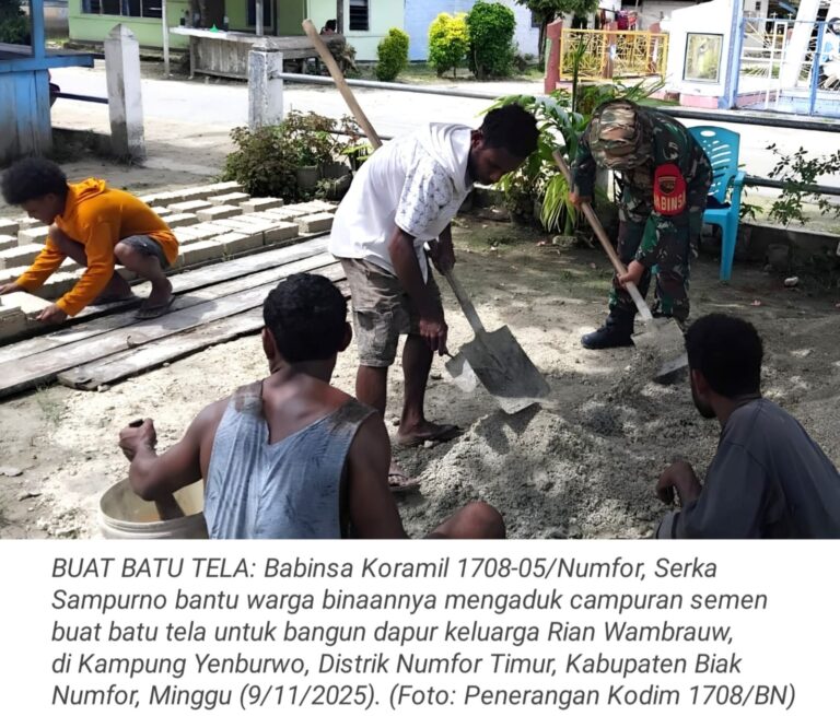 TOP-NEWS.id, NUMFOR - Babinsa Koramil 1708-05/Numfor, Serka Sampurno membantu warga binaannya mengaduk campuran semen untuk pembuatan batu tela di Kampung...