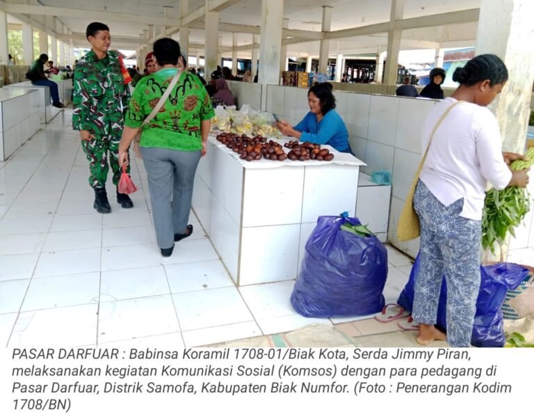 TOP-NEWS.id, BIAK - Babinsa Koramil 1708-01/Biak Kota, Serda Jimmy Piran, melaksanakan kegiatan Komunikasi Sosial (Komsos) dengan para pedagang di Pasar...