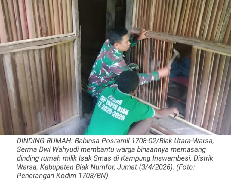 TOP-NEWS.id, WARSA - Babinsa Posramil 1708-02/Biak Utara-Warsa, Serma Dwi Wahyudi membantu warga binaannya memasang dinding rumah milik Isak Smas di...