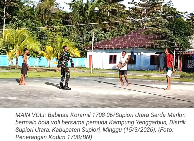 TOP-NEWS.id, SUPIORI - Upaya membudayakan olahraga di tengah masyarakat, Babinsa Koramil 1708-06/Supiori Utara Serda Marlon bermain bola voli bersama pemuda...