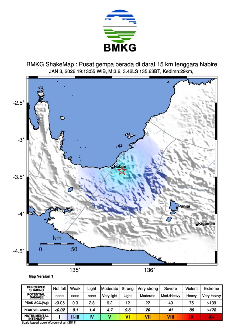 TOP-NEWS.id, JAYAPURA - Wilayah Kabupaten Nabire, Papua Tengah diguncang gempa tektonik, Sabtu (3/1/2026) pukul 21.13.55 WIT. Hasil analisis BMKG menunjukkan...