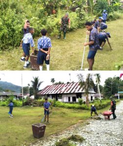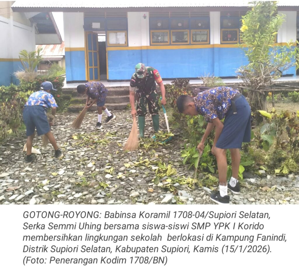 TOP-NEWS.id, SUPIORIBabinsa Koramil 1708-04/Supiori Selatan, Serka Semmi Uhing bergotong-royong bersama siswa-siswi SMP YPK I Korido membersihkan halaman sekolah berlokasi di Kampung Fanindi, Distrik Supiori Selatan, Kabupaten Supiori, Papua, Kamis (15/1/2026).