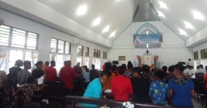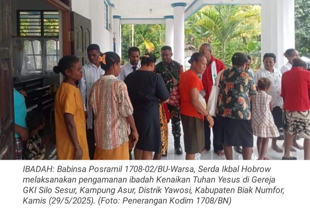 TOP-NEWS.id, WARSA – Babinsa Posramil 1708-02/BU-Warsa, Serda Ikbal Hobrow melaksanakan pengamanan ibadah Kenaikan Tuhan Yesus di Gereja GKI Silo Sesur, Kampung Asur, Distrik Yawosi, Kabupaten Biak Numfor, Papua, Kamis (29/5/2025).