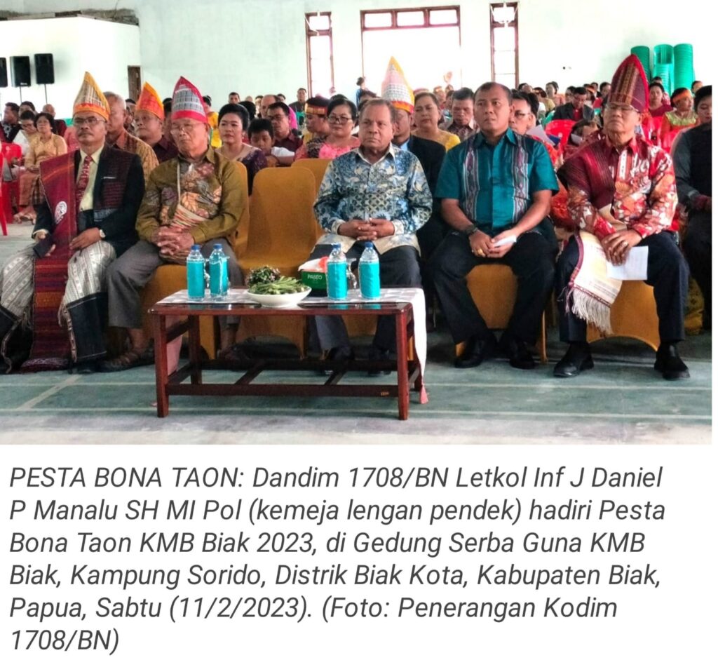 TOP-NEWS.id, BIAK – Dandim 1708/BN Letkol Inf J Daniel P Manalu SH MI Pol menghadiri acara Pesta Bona Taon Kerukunan Masyarakat Batak (KMB) Biak Tahun 2023, di Gedung Serba Guna KMB Biak, Kampung Sorido, Distrik Biak Kota, Kabupaten Biak Numfor, Papua, Sabtu (11/2/2023).