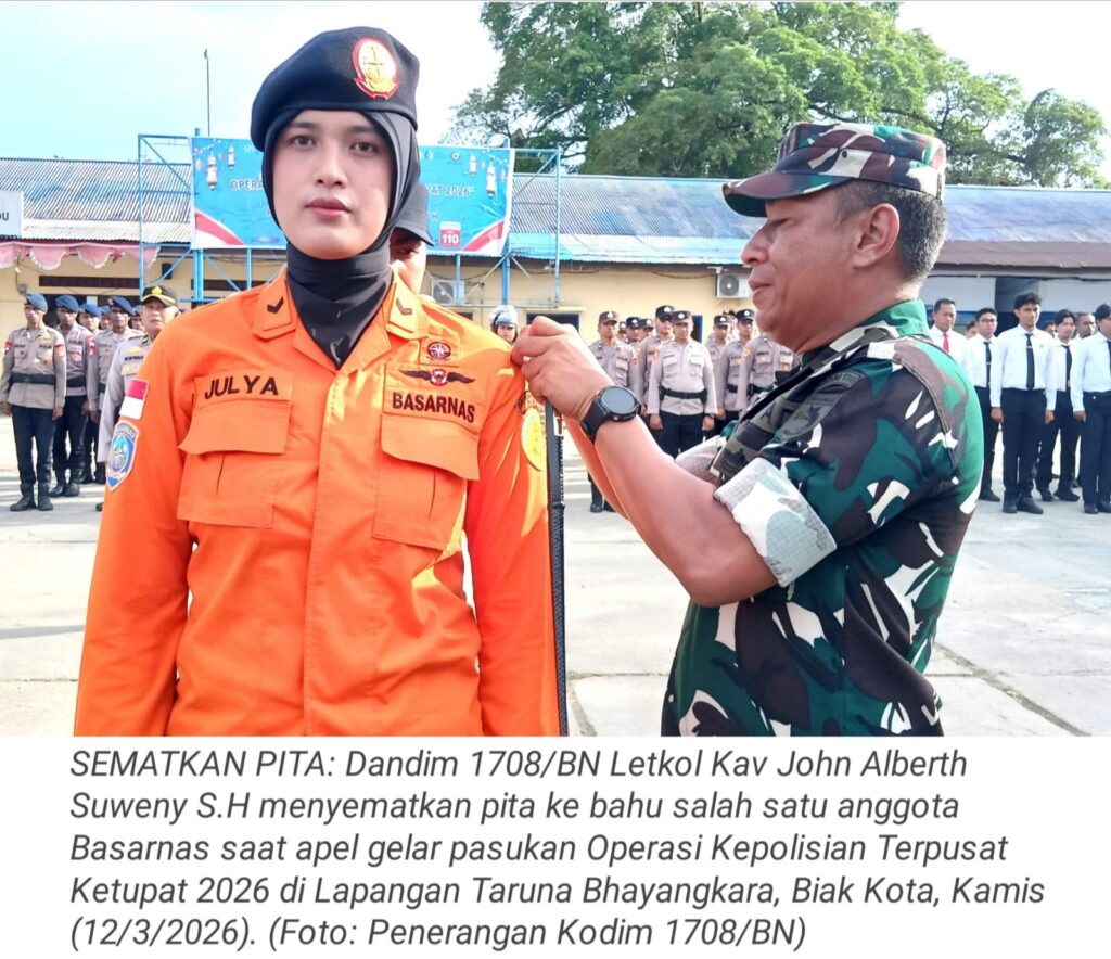 TOP-NEWS.id, BIAKDandim 1708/Biak Numfor Letkol Kav John Alberth Suweny, S.H mengikuti apel gelar pasukan Operasi Kepolisian Terpusat Ketupat 2026 di Lapangan Taruna Bhayangkara, Jalan Pangeran Diponegoro, Distrik Biak Kota, Kabupaten Biak Numfor, Papua, Kamis (12/3/2026).