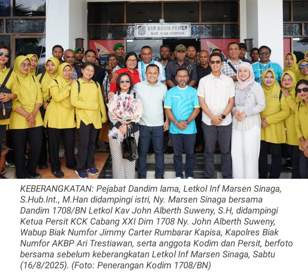 TOP-NEWS.id, BIAK – Dandim 1708/BN Letkol Kav John Alberth Suweny, S.H bersama jajaran Kodim 1708/BN melaksanakan pengantaran kepada Letkol Inf Marsen Sinaga, S.Hub.Int., M.Han dan istri usai menyelesaikan masa tugasnya sebagai Dandim 1708/BN.