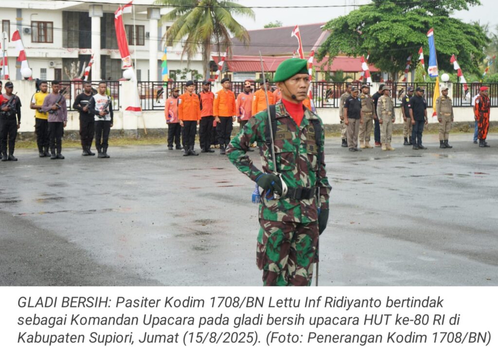 Dandim 1708/BN Tinjau Gladi Bersih Upacara HUT Ke-80 RI di Supiori