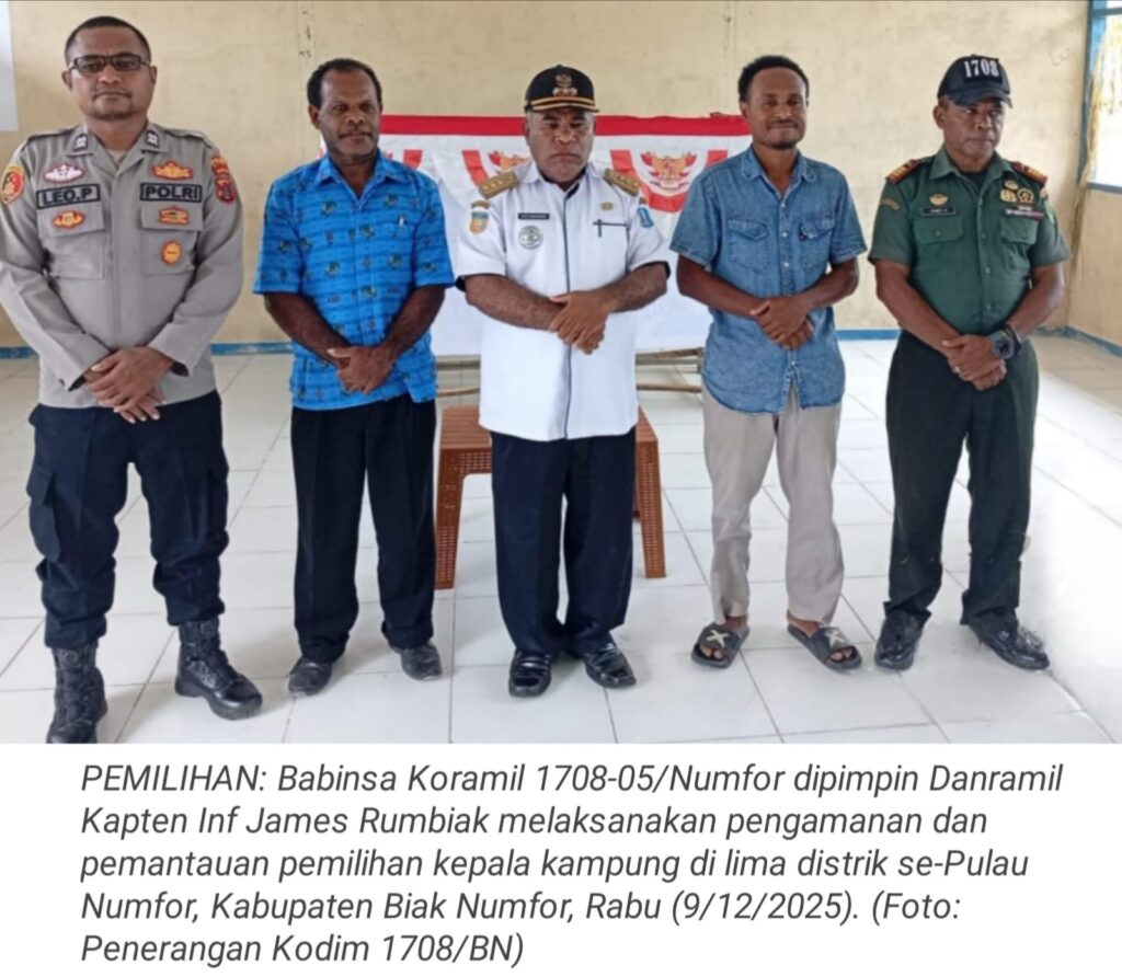 Kehadiran personel Babinsa bersama aparat keamanan membuat seluruh rangkaian pemilihan berjalan aman dan tertib se-Pulau Numfor, Kabupaten Biak Numfor, Papua, Rabu (10/12/2025).