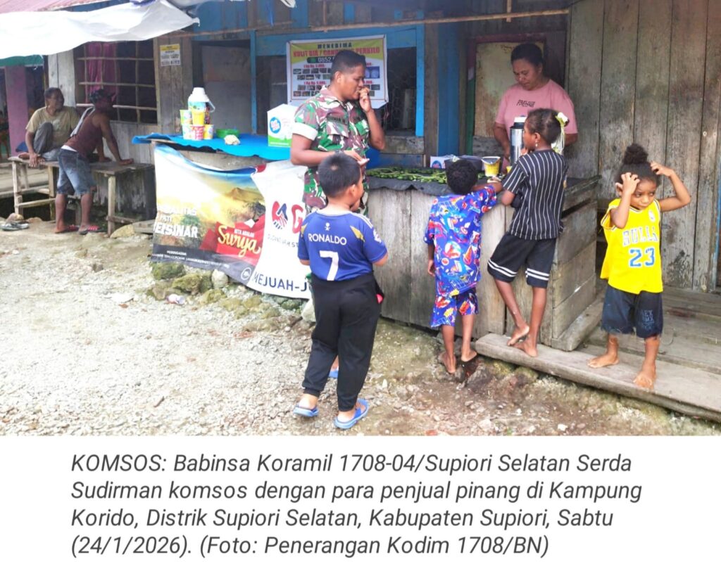 TOP-NEWS.id, SUPIORIBabinsa Koramil 1708-04/Supiori Selatan Serda Sudirman komunikasi sosial (komsos) dengan para penjual pinang di Kampung Korido, Distrik Supiori Selatan, Kabupaten Supiori, Papua, Sabtu (24/1/2026).