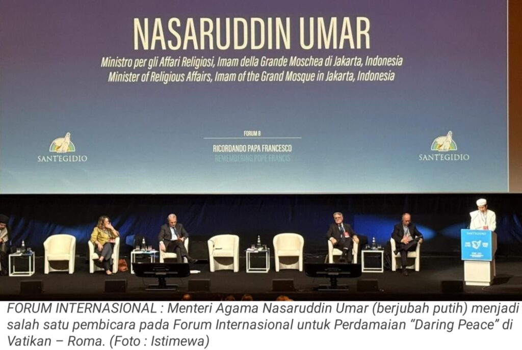 TOP-NEWS.id, VATIKAN – Menteri Agama Nasaruddin Umar menjadi salah satu pembicara pada Forum Internasional untuk Perdamaian “Daring Peace” di Vatikan – Roma. Di hadapan para tokoh dunia, Menag bicara tentang persaudaraan dan mengenang persahabatannya dengan mendiang Paus Fransiskus. Tepuk tangan tamu undangan sangat panjang di akhir sambutan Imam Besar Masjid Istiqlal.