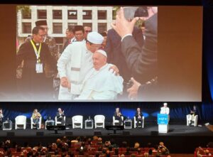 Bersamaan Menag mengenang persahabatannya dengan Paus Fransiskus, terpampang di layar, dua foto bersejarah. Foto Imam Besar Masjid Istiqlal mencium kening Paus Fransiskus dan foto Paus Fransiskus mencium tangan Imam Besar Masjid Istiqlal.