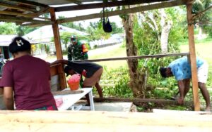 TOP-NEWS.id, NUMFOR – Babinsa Koramil 1708-05/Numfor Serda Baharum Herietrenggi membantu warga binaannya membangun pondok jualan milik Hendrik Rumbiak di Kampung Barkori, Distrik Numfor Timur, Kabupaten Biak Numfor, Papua, Rabu (11/2/2026).