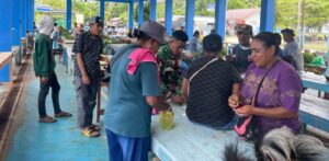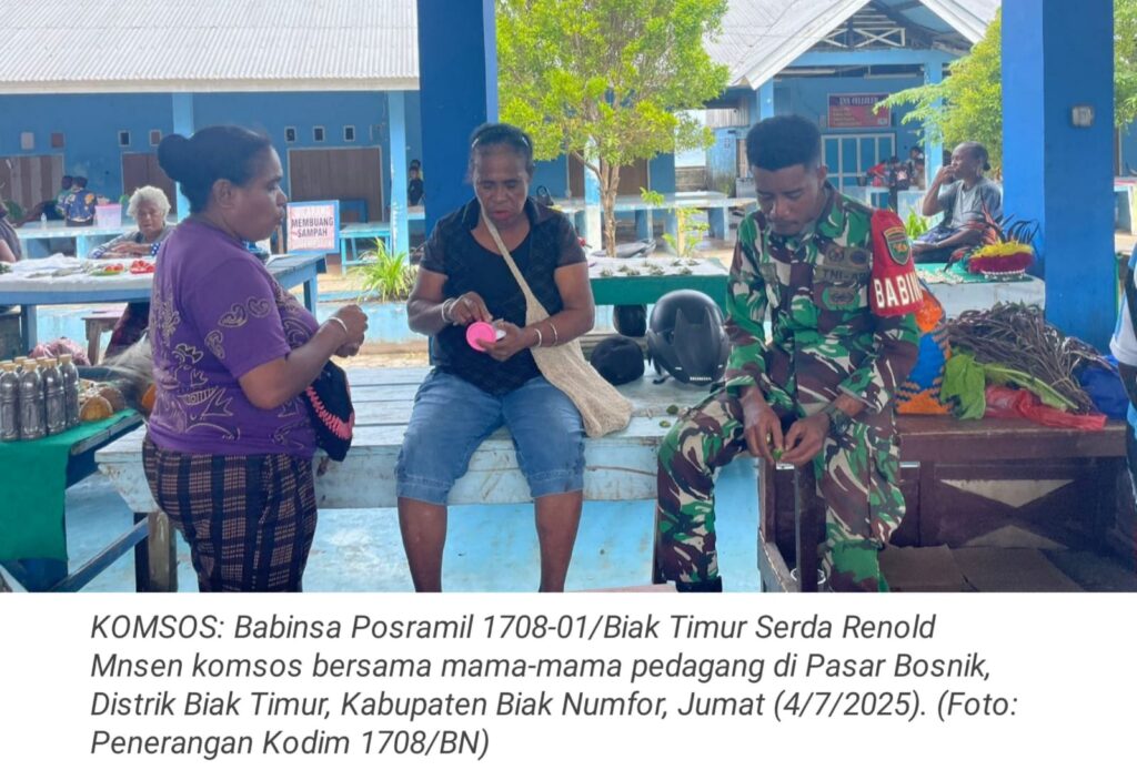 TOP-NEWS.id, BIAK TIMUR – Babinsa Posramil 1708-01/Biak Timur, Serda Renold Mnsen komunikasi sosial (komsos) bersama mama-mama pedagang di Pasar Bosnik, Distrik Biak Timur, Kabupaten Biak Numfor, Papua, Jumat (4/7/2025).