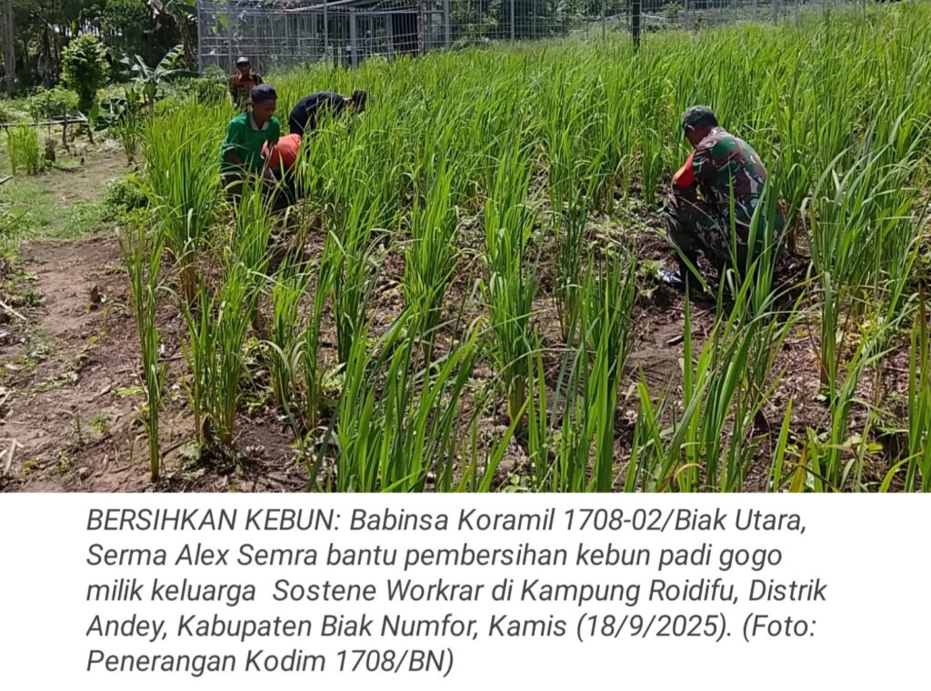 TOP-NEWS.id, BIAK – Dalam rangka mendukung ketahanan pangan (hanpangan) masyarakat, Babinsa Koramil 1708-02/Biak Utara, Serma Alex Semra turun langsung membantu warga membersihkan kebun padi gogo milik salah satu warga binaannya di Kampung Roidifu, Distrik Andey, Kabupaten Biak Numfor, Papua, Kamis (18/9/2025).