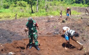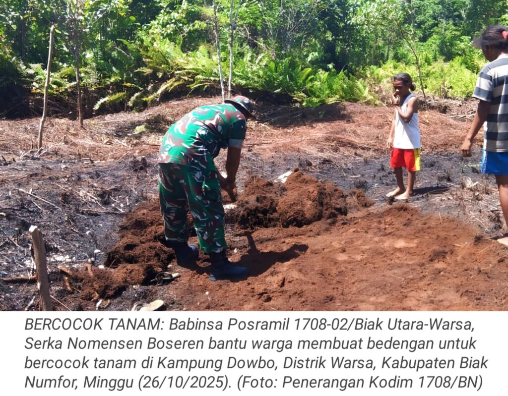 TOP-NEWS.id, WARSA – Upaya mendukung ketahanan pangan dan memberikan semangat kepada para petani di wilayah binaan, Babinsa Posramil 1708-02/Biak Utara-Warsa, Serka Nomensen Boseren turun langsung membantu warga membuat bedengan untuk bercocok tanam di Kampung Dowbo, Distrik Warsa, Kabupaten Biak Numfor, Papua, Minggu (26/10/2025).