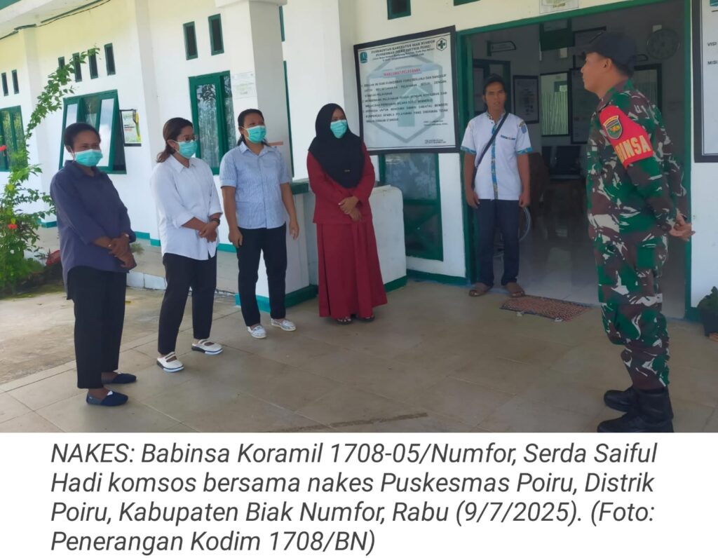 TOP-NEWS.id, NUMFOR – Upaya mempererat kerja sama dan meningkatkan kepedulian terhadap kondisi kesehatan masyarakat, Babinsa Koramil 1708-05/Numfor, Serda Saiful Hadi melaksanakan kegiatan komunikasi sosial (komsos) bersama tenaga kesehatan (nakes) di Puskesmas Poiru, Distrik Poiru, Kabupaten Biak Numfor, Provinsi Papua, Rabu (9/7/2025).