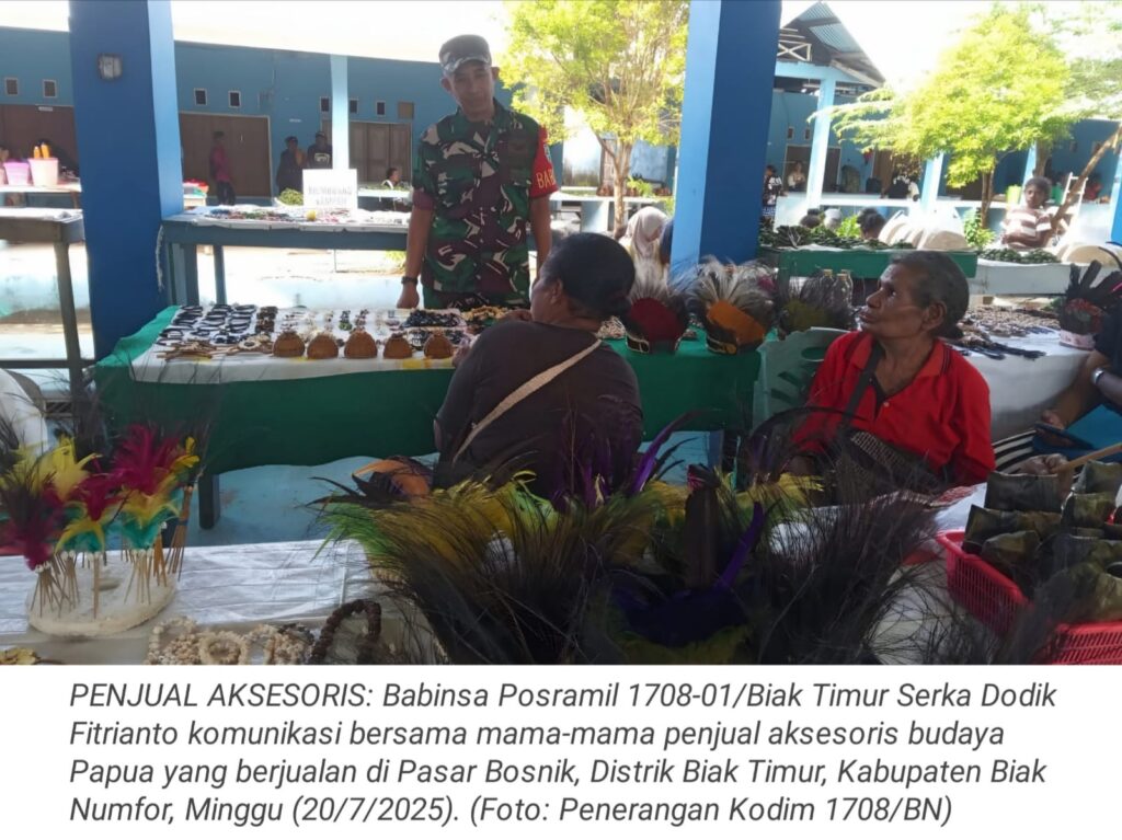 TOP-NEWS.id, BIAK TIMUR – Upaya mendukung pertumbuhan ekonomi masyarakat di wilayah binaannya, Babinsa Posramil 1708-01/Biak Timur Serka Dodik Fitrianto komunikasi sosial (komsos) bersama mama-mama penjual aksesoris budaya Papua yang berjualan di Pasar Bosnik, Distrik Biak Timur, Kabupaten Biak Numfor, Papua, Minggu (20/7/2025).