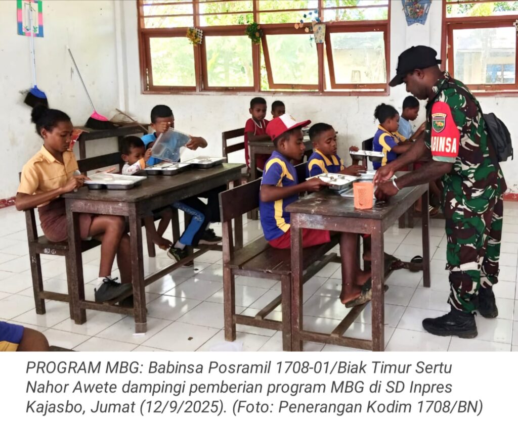 TOP-NEWS.id, BIAK TIMUR – Dalam rangka mendukung program pemerintah makan bergizi gratis (MBG) bagi anak usia sekolah, Babinsa Posramil 1708-01/Biak Timur ikut serta mendampingi pembagian makanan bergizi di sejumlah sekolah di Distrik Biak Timur, Kabupaten Biak Numfor, Papua, Jumat (12/9/2025).