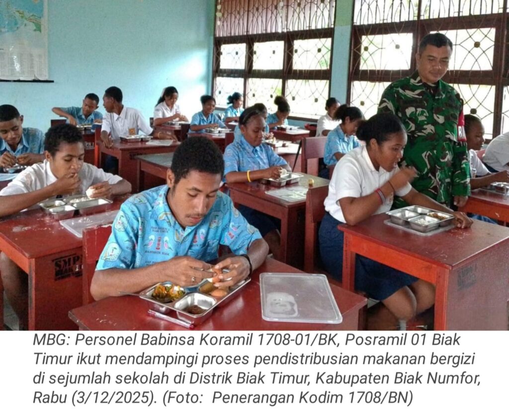 TOP-NEWS.id, BIAK TIMUR – Program Makan Bergizi Gratis (MBG) bagi anak sekolah terus mendapat dukungan dari TNI. Babinsa Koramil 1708-01/BK, Posramil 01 Biak Timur ikut mendampingi proses pendistribusian makanan bergizi di sejumlah sekolah di Distrik Biak Timur, Kabupaten Biak Numfor, Papua, Rabu (3/12/2025).