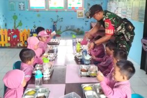 Babinsa mengatakan, kehadirannya dalam kegiatan itu merupakan bentuk dukungan terhadap program pemerintah yang langsung menyentuh kebutuhan dasar anak-anak.