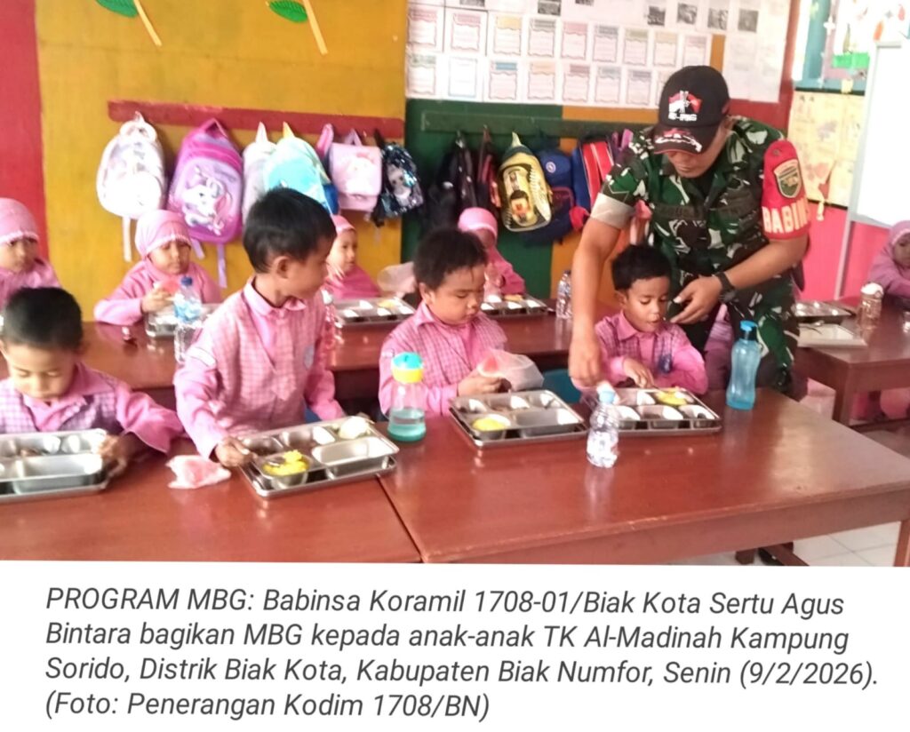 TOP-NEWS.id, BIAK KOTA – Babinsa Koramil 1708-01/Biak Kota Sertu Agus Bintara mendampingi pelaksanaan program Makan Bergizi Gratis (MBG) di Taman Kanak-Kanak (TK) Al-Madinah dan Sekolah Dasar (SD) Al-Madinah, Kampung Sorido, Distrik Biak Kota, Kabupaten Biak Numfor, Papua, Senin (9/2/2026).