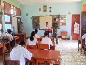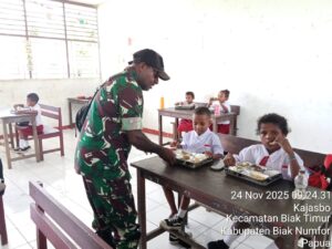 TOP-NEWS.id, BIAK TIMUR – Dalam rangka mendukung program Makan Bergizi Gratis (MBG) bagi anak sekolah, Babinsa Posramil 1708-01/BK Biak Timur turut mendampingi proses pendistribusian makanan bergizi di sejumlah sekolah yang ada di Distrik Biak Timur, Kabupaten Biak Numfor, Senin, (24/11/2025).