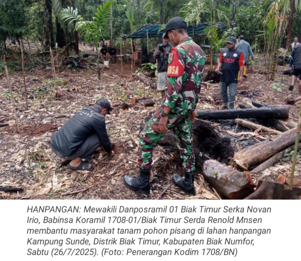 TOP-NEWS.id, BIAK TIMUR – Mewakili Danposramil 01 Biak Timur Serka Novan Irio, Babinsa Koramil 1708-01/Biak Timur Serda Renold Mnsen ikut membantu masyarakat dalam penanaman pohon pisang di lahan ketahanan pangan (hanpangan) Kampung Sunde, Distrik Biak Timur, Kabupaten Biak Numfor, Papua, Sabtu (26/7/2025).